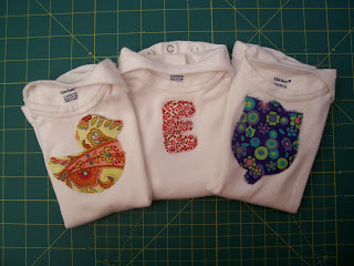 For the custom onesies, I used basic, plain white onesies. I found these at Target. I used some scraps of fabric for the appliques. The fabric for the "E" is actually some of the red fabric my sister and I used for this project, which was a gift for Little E's parents. Aww!